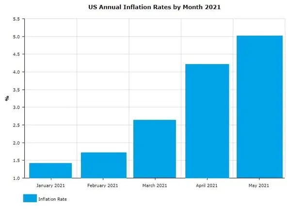 The Fed has also raised its expectations for inflation considerably. In May 2021, the annual inflation rate reached 5%, outpacing all previous months, hitting the highest level of the last decade, according to inflationdata.com.