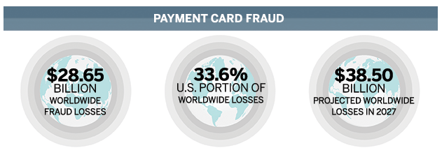 According to the latest Nilson Report, worldwide losses to card fraud reached a staggering total of $28.65 billion and US card fraud losses accounted for 33.6% of those total losses. And the projection is that by 2027, card fraud losses will mount to $38.5 billion worldwide.