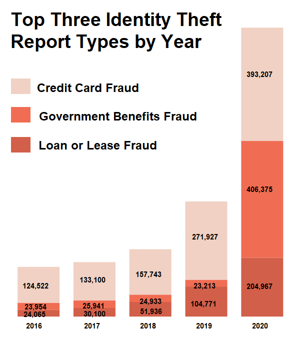 Credit card fraud is one of the most frequent types of identity theft in the US. Prior to 2020's unprecedented rise in fraud related to application for government benefits (likely as the result of COVID-19-related fraud), credit card fraud topped the list of identity theft types by a wide margin for multiple years in a row.
